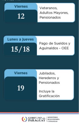 El movimiento de fondos arrancará el viernes 12 de diciembre, fecha marcada para los pagos a veteranos del Chaco, adultos mayores y pensionados. A partir de ahí, la dinámica seguirá con el pago de salarios y aguinaldos para los funcionarios de los Organismos y Entidades del Estado (OEE), programado entre el lunes 15 y el jueves 18.