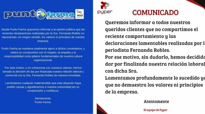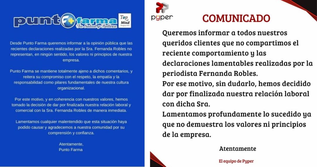 La primera empresa en pronunciarse fue la cadena de farmacias Punto Farma, una de las más grandes del país, que publicó un comunicado oficial anunciando la ruptura inmediata de su vínculo comercial con la comunicadora.