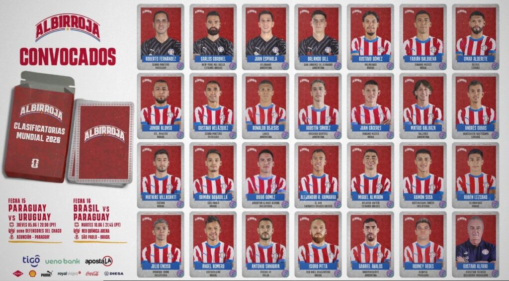 Fuente: Asociación Paraguaya de Fútbol – El seleccionador paraguayo, Gustavo Alfaro, acaba de dar a conocer la lista de 27 jugadores que defenderán los colores de la Albirroja en los próximos compromisos de las Eliminatorias Sudamericanas rumbo al Mundial 2026. Los encuentros ante Uruguay y Brasil prometen ser vibrantes, y la nómina incluye sorpresas, ausencias notorias y el regreso de un arquero que superó un difícil momento personal.– (Foto captura de pantalla de X).